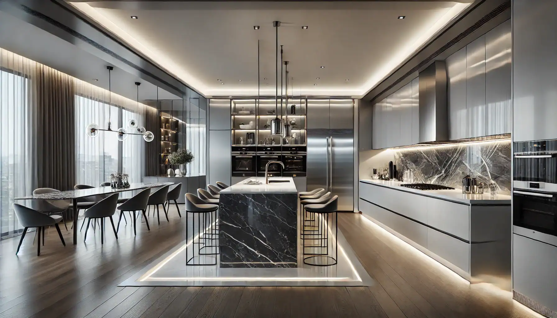 DALL·E 2025 01 16 17.05.48 An ultra modern luxury kitchen with futuristic elements. The design features sleek matte black cabinetry a white quartz waterfall island with integra