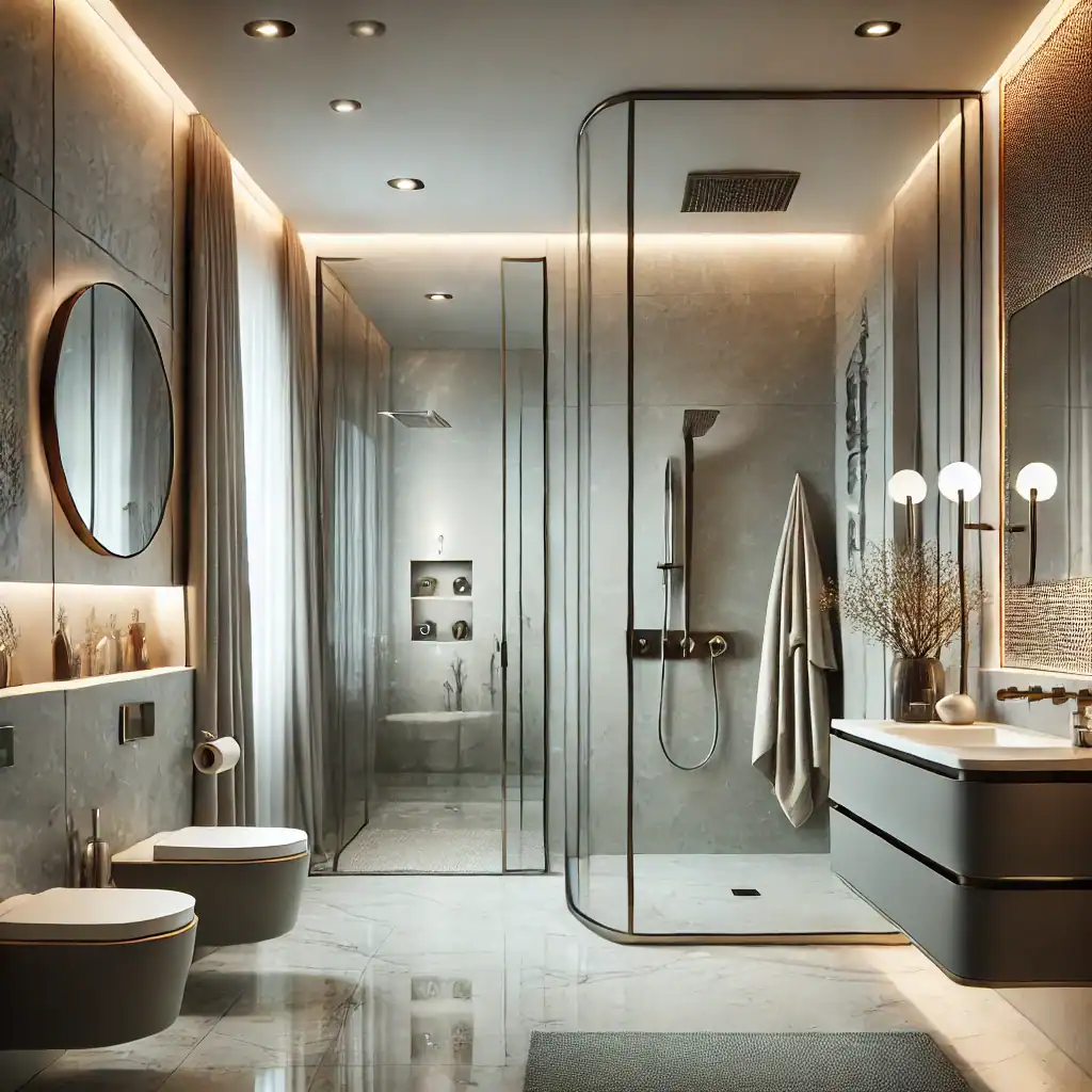 Frameless glass enclosures with nearly invisible hardware define this style. It’s the go-to choice for newer builds in communities like Mahogany, Evanston, and Seton, where homeowners want a sleek, hotel-like look. Neutral colour palettes—whites, greys, and light beiges—pair with large-format porcelain tiles and linear drains to create seamless transition from bathroom floor to shower.